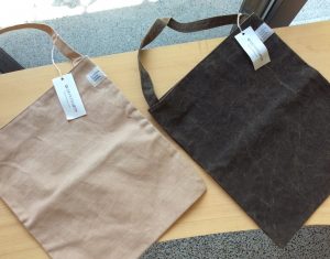 こちらは、「凪バッグ」。瀬戸内海の静かな海をイメージしているのです。こちらは、ワタ染めと柿渋鉄媒染。ほかに柿渋、鉄粉プリントがあります。A4がちょうど入るサイズ、マチ無し、ぺったんこでカワイイ・・・