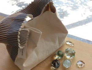こちらは、「凪バッグ」。瀬戸内海の静かな海をイメージしているのです。こちらは、ワタ染めと柿渋鉄媒染。ほかに柿渋、鉄粉プリントがあります。A4がちょうど入るサイズ、マチ無し、ぺったんこでカワイイ・・・
