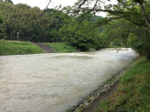 長尾川は、昨日の雨で増水!川幅いっぱいに濁流が流れています。