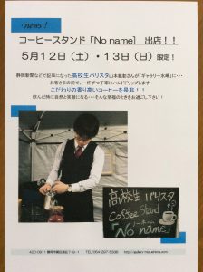 高校生バリスタの期間限定コーヒースタンド「No name」12日と13日に出店! 2018年5月7日2018年5月7日 高校生バリスタ山本紘彰さんの出張コーヒースタンド「No name」が期間限定で登場します。 「静岡新聞」や「とびっきり静岡」でも紹介されました! 5月12日(土)・13日(日)のみになりますが、一杯ずつ丁寧にハンドドリップしたこだわりのコーヒーを、是非この機会にお試し下さいませ! 12日(土)は5月企画展「写真と光のART展」の初日となります。あわせてお楽しみ頂ければ幸いです!!! みなさまのお越しをお待ちいたしております!!! 共有: Facebook で共有するにはクリックしてください (新しいウィンドウで開きます) Facebook クリックして X で共有 (新しいウィンドウで開きます) X 関連
