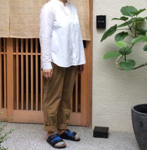 コットンリネンシャツブラウス、洗いざらしを着用しています。袖はロールアップしてボタン止めもできます。パンツはパラシュートクロスパンツのブラウン、サイズはユニセックスサイズ1、女性のM、男性のXS〜Sになります。裾をロールアップして着用!(相当折り上げておますので、足長さんも大丈夫!)