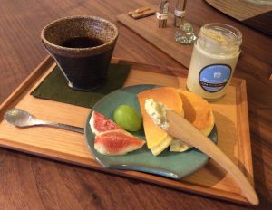 お食事パンケーキに、作ったばかりのバターナイフで、ブルーチーズディップをつけま〜す。