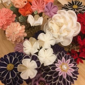 つまみホリック:静岡市在住。娘の成人式でつまみ細工と出会い、独学で始める。小さな数枚の生地から生み出される花々に魅了され、作家活動を開始。「ハレノヒ」の特別な髪飾りだけではなく、「ケノヒ」普段使いにもできるさまざまなつまみ細工作品を制作。