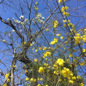 こちらは昨日の「ウンナンオウバイ」と後ろにちょこっと白く咲いているのが「ハクモクレン」です。