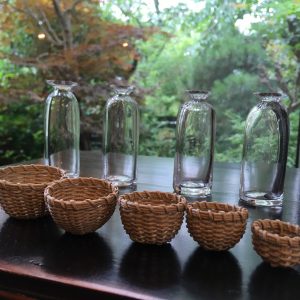 一輪挿しのガラス花瓶は高さ10cmほど、手前のミニかごは手のひらにおさまる小ささ〜