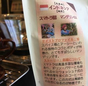 今回のコーヒーは、インドネシア、スマトラ産のマンデリン。今月のスイーツ「チーズケーキ」に合わせました!