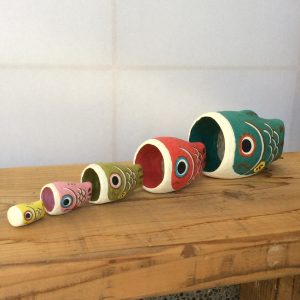 「はりこーシカ」。和紙で作られてます。お父さん鯉の口の中にみ〜んな収まります。