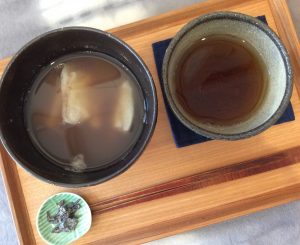 甘さ控えめの「おしるこ」は、ほうじ茶と塩昆布と共にど〜ぞ!