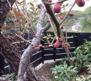 ギャラリー庭の紅梅、つぼみはまだ固いけれど、紅色がはっきりしてきました。もうすこし・・・