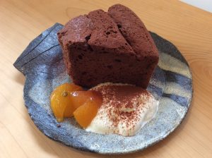 CAFEではバレンタインにちなんで、「チョコレートシフォンに金柑の砂糖煮添え」をご用意してみなさまのお越しをお待ちしております!