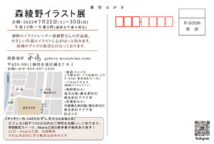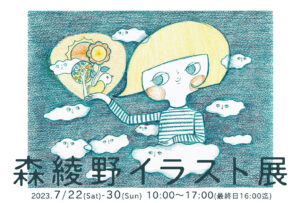 7月の「森綾野イラスト展」には、みなさま暑い中お越しいただきありがとうございました。8月はお休みをいただき9月の企画展のお知らせをさせていただきます。